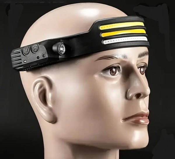 Linterna led vincha a batería recargable. Modo fijo y sensor de movimiento. 3 líneas leds frontales más led lateral.